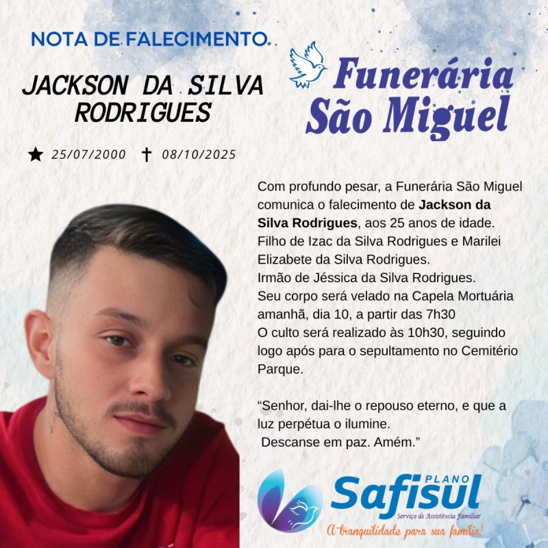 Com profundo pesar, a Funerária São Miguel comunica o falecimento de Jackson da Silva Rodrigues, ocorrido no dia 08 de outubro de 2025, aos 25 anos de idade.