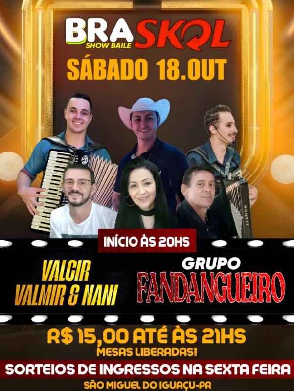 Neste final de semana, o Clube Braskol , em São Miguel do Iguaçu, será palco de uma grande celebração musical! A noite de sábado (18) promete muita animação com o show de Valcir, Valmir e Nany – o musical VVN , seguido do aguardado bailão com o Grupo Fandangueiro , que se apresenta pela primeira vez na cidade.