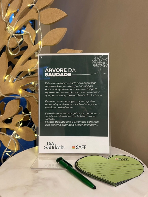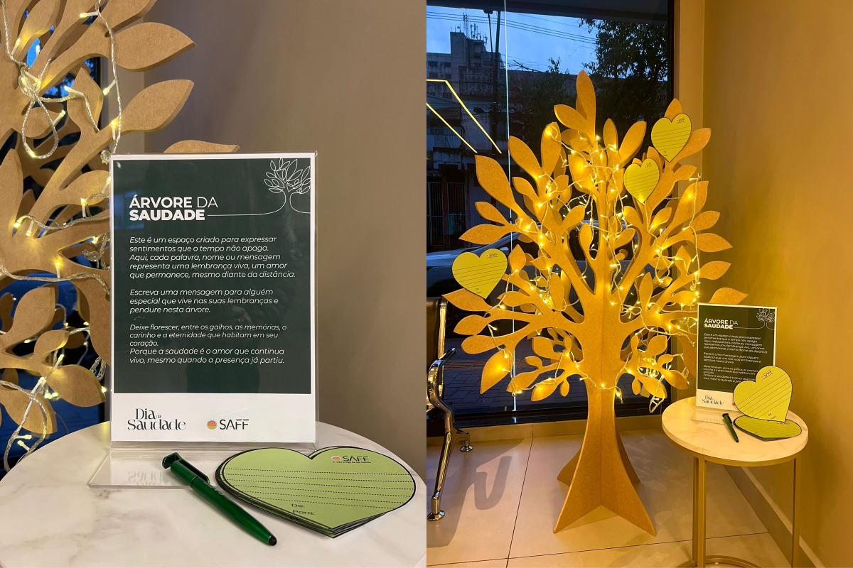 Entre os dias 27 de outubro e 1º de novembro, a SAFF – Serviços de Assistência Familiar realiza em todas as suas unidades a ação especial “Árvore da Saudade”, uma homenagem sensível que antecede o Dia de Finados, conhecido pela empresa como o “Dia da Saudade”.