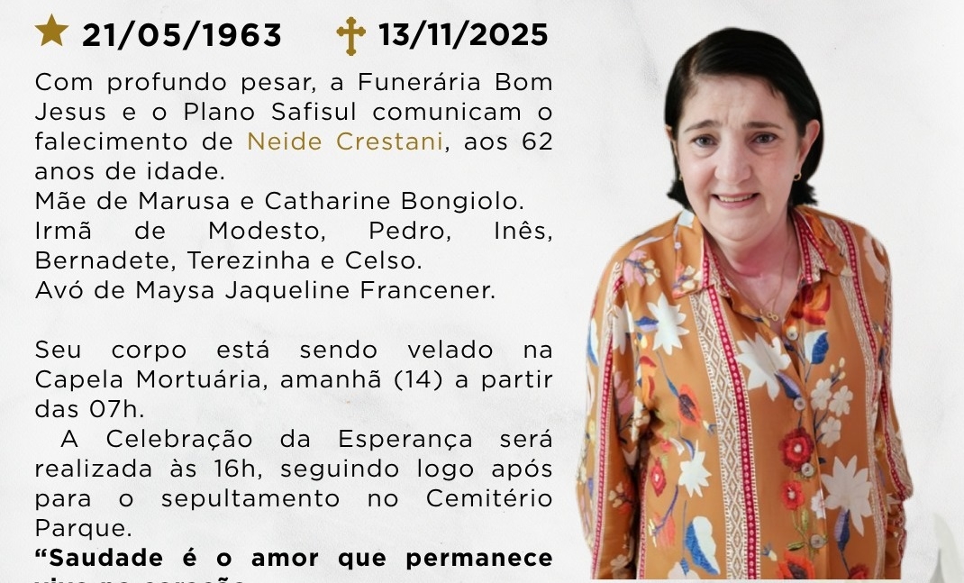 Com profundo pesar, a Funerária Bom Jesus e o Plano Safisul comunicam o falecimento de Neide Crestani, ocorrido nesta quinta-feira, 13 de novembro de 2025, aos 62 anos de idade.