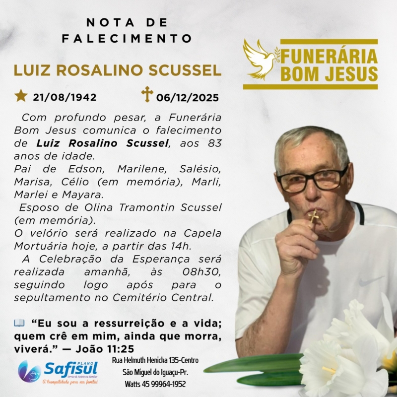 Neste momento de dor e saudade, expressamos nossos mais sinceros sentimentos aos familiares e amigos enlutados, desejando que encontrem conforto e paz. Que a memória de Luiz Rosalino Scussel permaneça viva no coração de todos que tiveram o privilégio de conviver com ele.