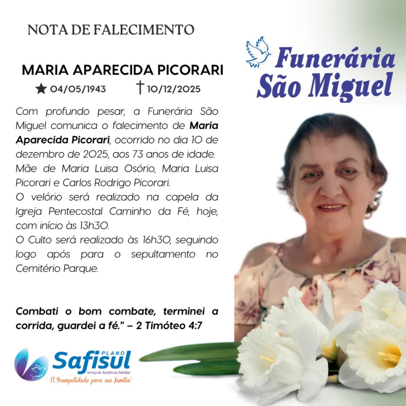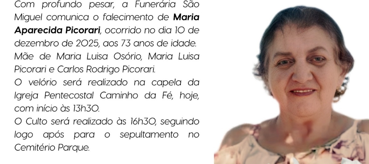 Com profundo pesar, a Funerária São Miguel comunica o falecimento de Maria Aparecida Picorari, ocorrido ontem, 10 de dezembro de 2025, aos 73 anos de idade. Moradora conhecida e estimada em São Miguel do Iguaçu, Maria Aparecida deixa uma trajetória marcada pelo carinho dedicado à família e pelos vínculos construídos ao longo da vida.