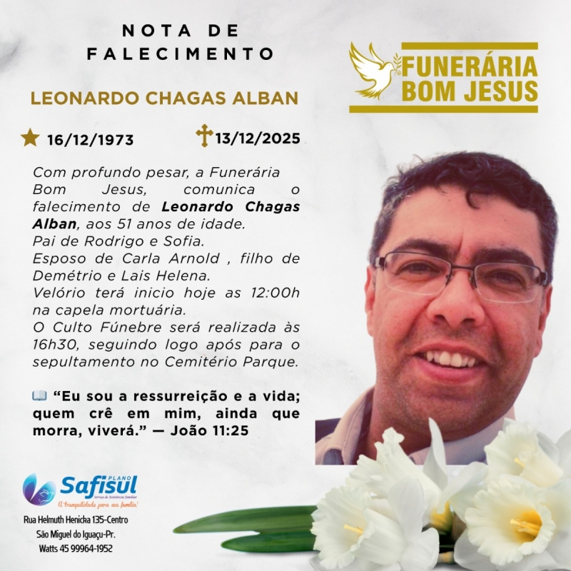Com profundo pesar, a Funerária Bom Jesus comunica o falecimento de Leonardo Chagas Alban, ocorrido nesta sexta-feira, 13 de dezembro de 2025, aos 51 anos de idade, em São Miguel do Iguaçu.