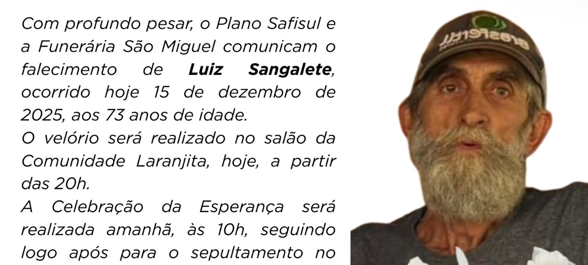 Com profundo pesar, o Plano Safisul e a Funerária São Miguel comunicam o falecimento de Luiz Sangalete, ocorrido nesta segunda-feira, 15 de dezembro de 2025, aos 73 anos de idade.