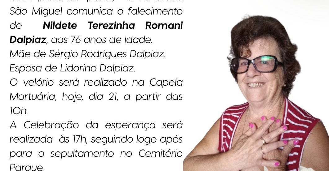 A Funerária São Miguel comunica, com profundo pesar, o falecimento de Nildete Terezinha Romani Dalpiaz, ocorrido ontem, 20 de janeiro de 2026, aos 76 anos de idade.