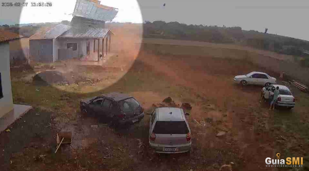 Nas imagens, duas pessoas que estavam no terreno tentam se abrigar próximo a veículos, quando uma rajada intensa atinge o imóvel e lança completamente a cobertura ao chão. Toda a ação dura menos de 10 segundos.