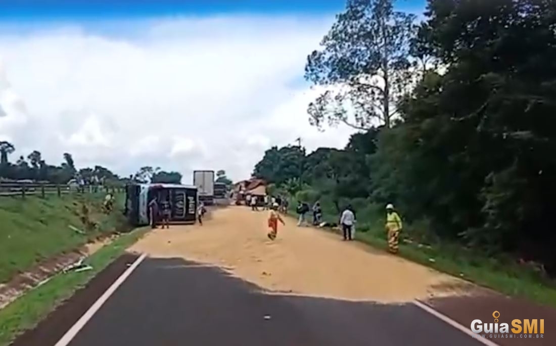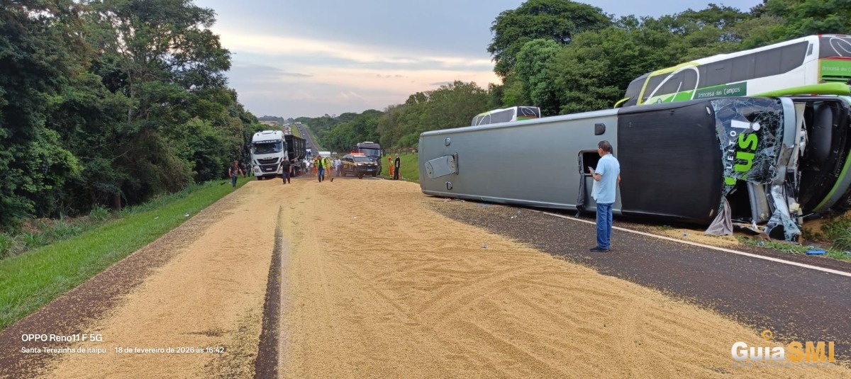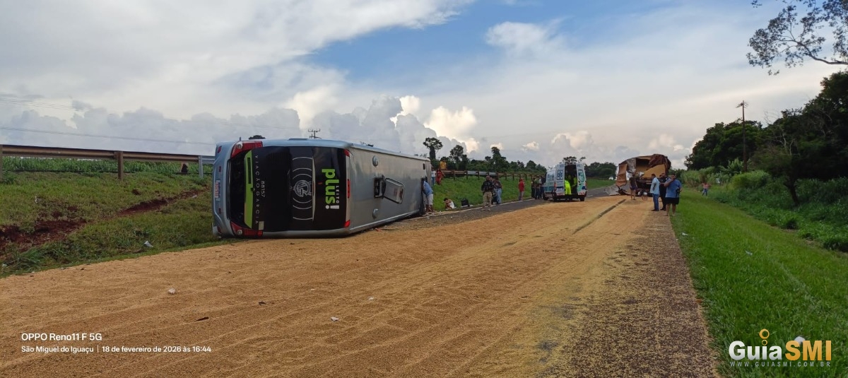 Com o impacto, o ônibus tombou sobre a pista e a carreta provocou o derramamento de carga de soja bloqueando totalmente o tráfego no sentido São Miguel. Diversas ambulâncias foram mobilizadas para prestar atendimento às vítimas, que foram socorridas e encaminhadas a diferentes hospitais da região. Até o momento, não há divulgação oficial sobre o estado de saúde dos envolvidos.