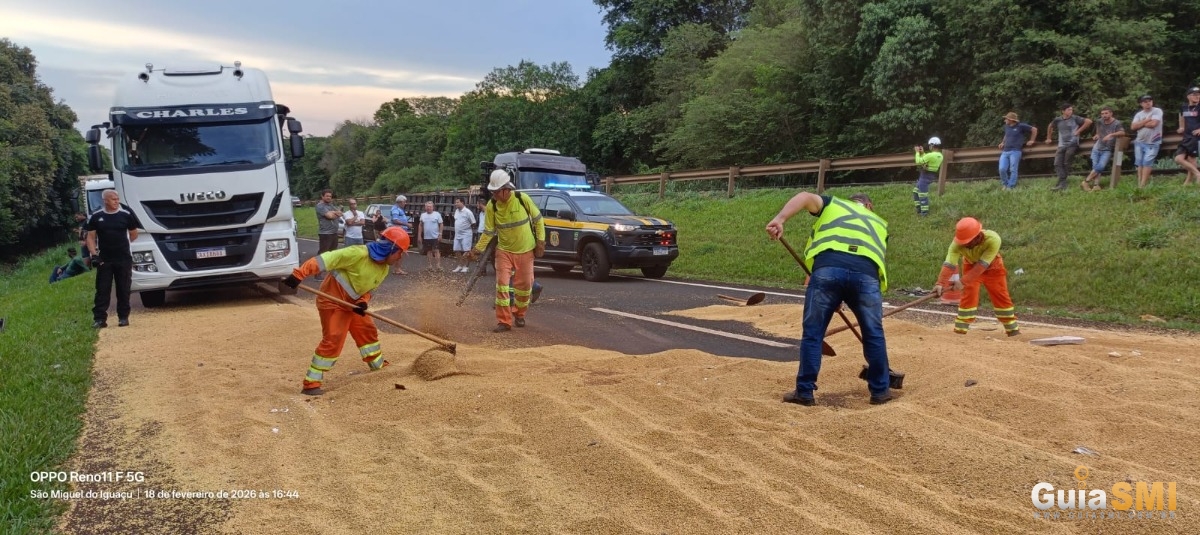 A concessionária EPR Iguaçu atua no local realizando a limpeza da pista e trabalhando para a liberação do trecho afetado. A Polícia Rodoviária Federal e a Guarda Municipal auxiliam na segurança da ocorrência e na orientação do trânsito.