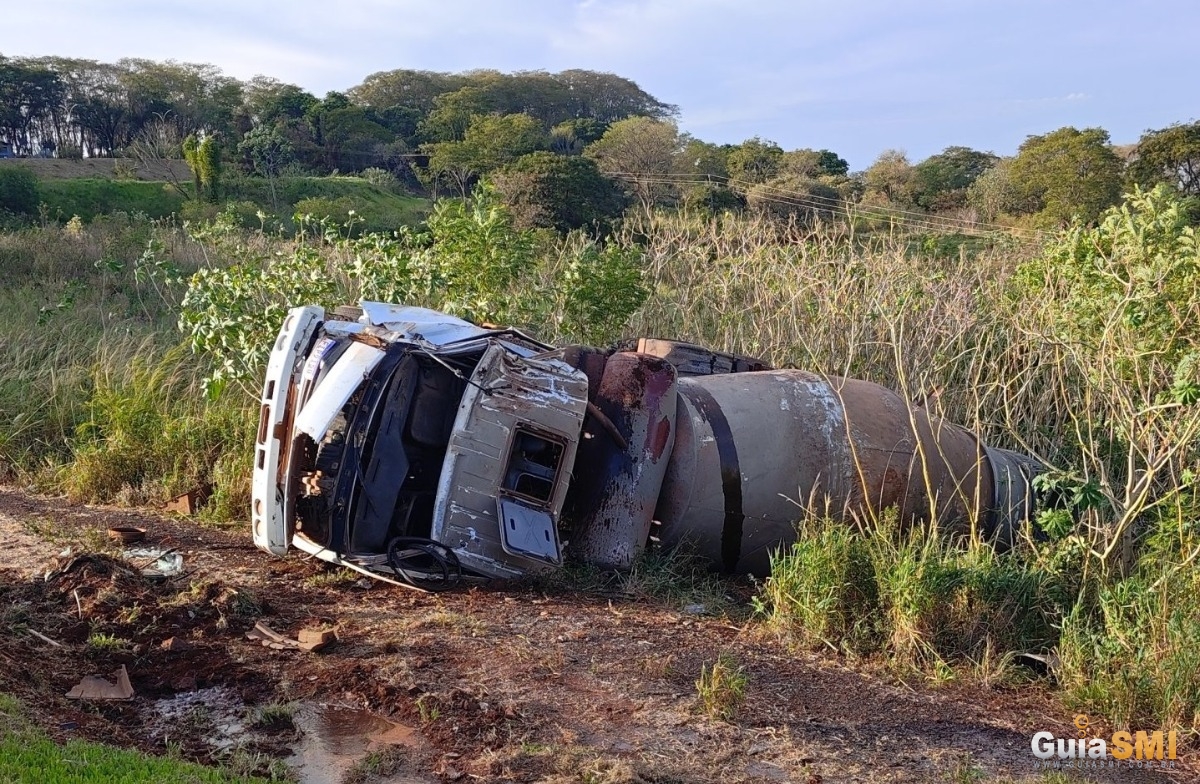 Ao chegar ao local, os socorristas encontraram um caminhão betoneira tombado, com o motorista preso na cabine. A situação exigiu atenção e cuidado durante o atendimento, devido à posição do veículo e ao risco de agravamento dos ferimentos.