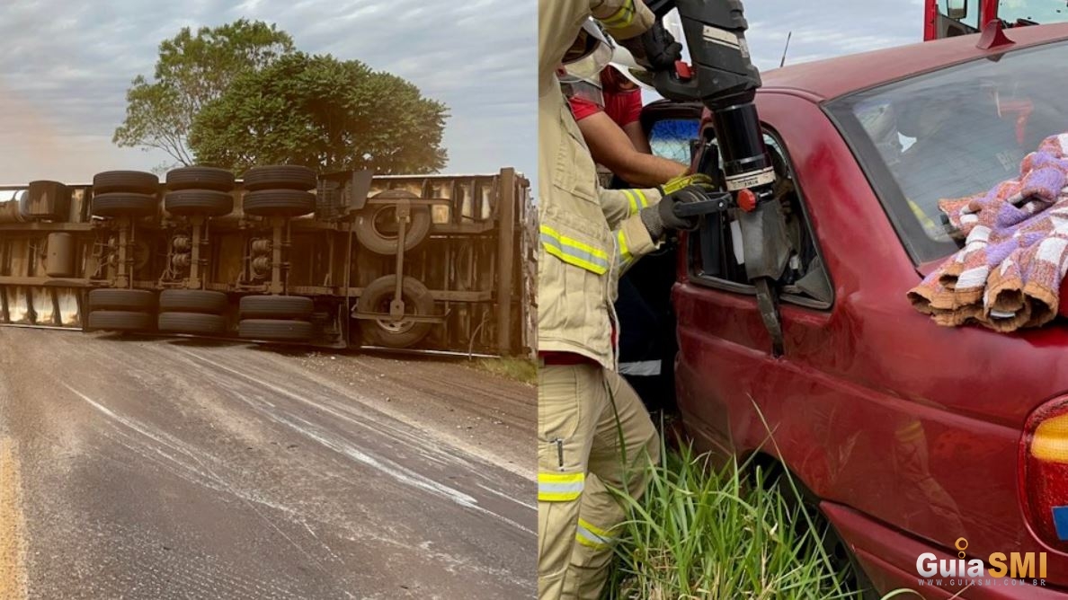 Colisão entre carro e duas carretas em Cascavel espalhou carga de carne na pista e mobilizou equipes do Corpo de Bombeiros