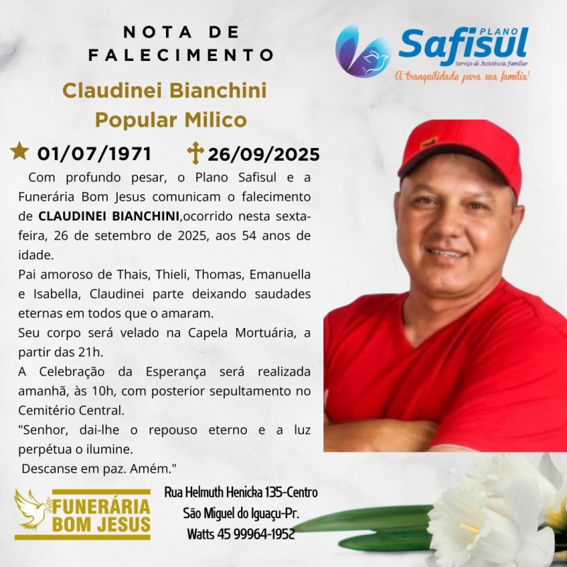 Com profundo pesar, o Plano Safisul e a Funerária Bom Jesus comunicam o falecimento de Claudinei Bianchini, ocorrido nesta sexta-feira, 26 de setembro de 2025, aos 54 anos de idade.