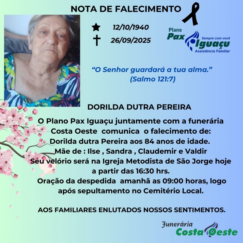 Com pesar, o Plano Pax Iguaçu e a Funerária Costa Oeste comunicam o falecimento de Dorilda Dutra Pereira, ocorrido nesta sexta-feira, 26 de setembro de 2025, aos 84 anos de idade.