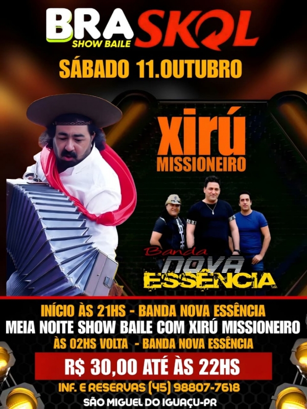 O final de semana promete ser de pura diversão em São Miguel do Iguaçu! Neste sábado, dia 11 de outubro de 2025, o tradicional Clube Braskol será palco de um Mega Show Baile com Xiru Missioneiro, um dos nomes mais queridos da música regional.
