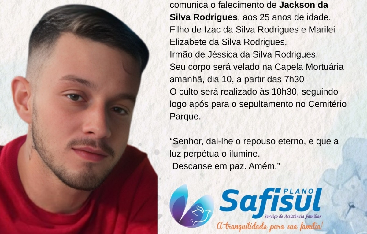 Com profundo pesar, a Funerária São Miguel comunica o falecimento de Jackson da Silva Rodrigues, ocorrido no dia 08 de outubro de 2025, aos 25 anos de idade.