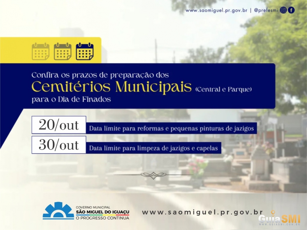 O Governo Municipal de São Miguel do Iguaçu, por meio da Secretaria de Assuntos Comunitários, informa que qualquer reforma em jazigos deve ser previamente autorizada pela Central de Luto, localizada no andar térreo do Paço Municipal Abel Bez Batti, ao lado do calçadão dos bancos.