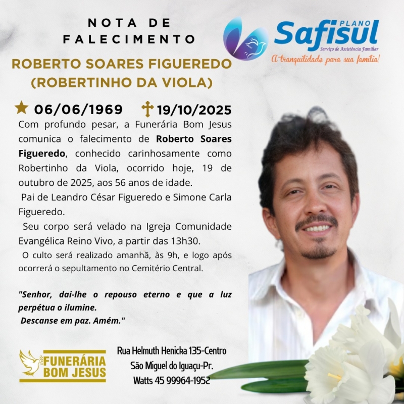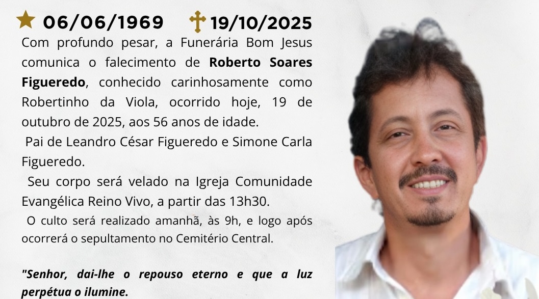 É com profundo pesar que a Funerária Bom Jesus comunica o falecimento de Roberto Soares Figueredo, carinhosamente conhecido como Robertinho da Viola, ocorrido neste domingo, 19 de outubro de 2025, aos 56 anos de idade.