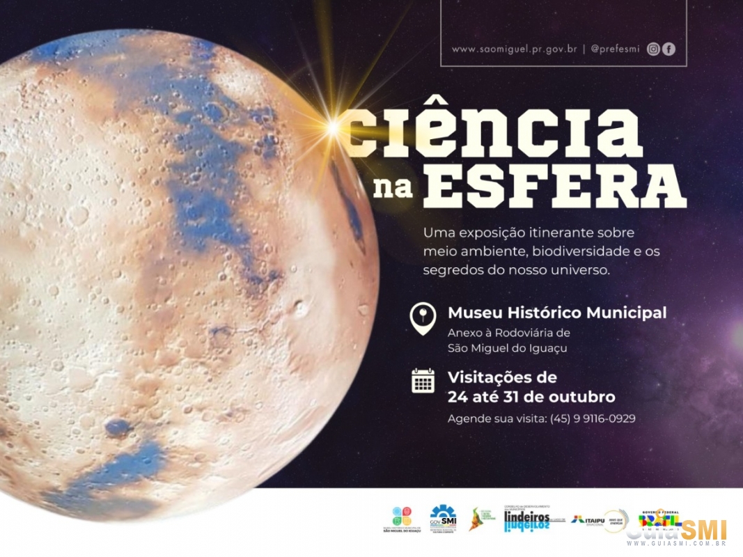 Na mesma ocasião, será realizada a abertura da Exposição Itinerante “Ciência da Esfera”, promovida pela Itaipu Binacional, em parceria com o Governo Municipal, o Conselho de Desenvolvimento dos Municípios Lindeiros ao Lago de Itaipu, por meio do Convênio Linha Ecológica, e a Rede Cultura Oeste Paraná.