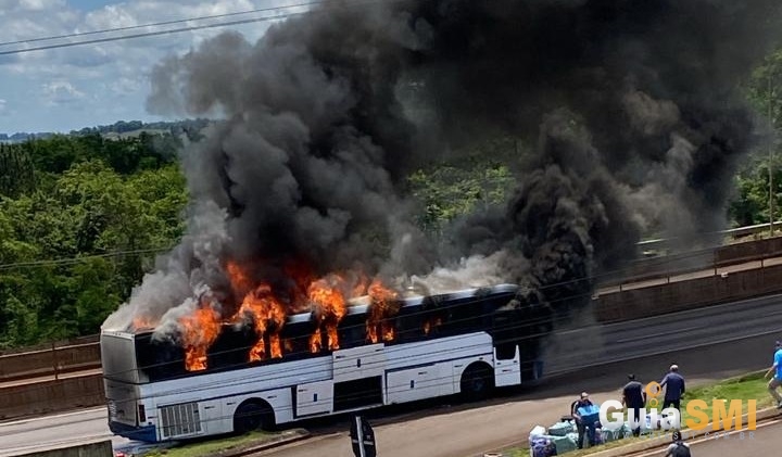 Um ônibus que transportava compristas foi completamente destruído por um incêndio na BR-277, entre Matelândia e o Distrito Agro Cafeeira, no final da manhã desta quinta-feira (30).