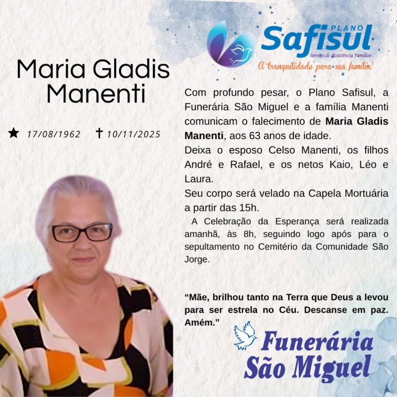 Maria Gladis era esposa de Celso Manenti, mãe de André e Rafael, e avó dedicada de Kaio, Léo e Laura. Sua partida deixa um grande vazio no coração dos familiares e amigos que tiveram o privilégio de conviver com seu carinho, sabedoria e alegria.