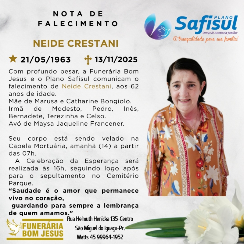 Com profundo pesar, a Funerária Bom Jesus e o Plano Safisul comunicam o falecimento de Neide Crestani, ocorrido nesta quinta-feira, 13 de novembro de 2025, aos 62 anos de idade.