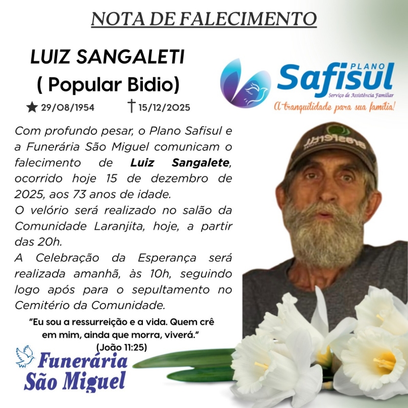 Com profundo pesar, o Plano Safisul e a Funerária São Miguel comunicam o falecimento de Luiz Sangalete, ocorrido nesta segunda-feira, 15 de dezembro de 2025, aos 73 anos de idade.