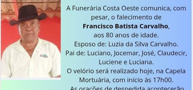 A Funerária Costa Oeste comunica, com pesar, o falecimento de Francisco Batista Carvalho, ocorrido nesta quinta-feira, 25 de dezembro de 2025, aos 80 anos de idade.