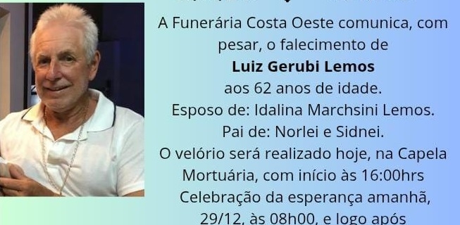 A Funerária Costa Oeste comunica, com profundo pesar, o falecimento de Luiz Gerubi Lemos, ocorrido neste domingo, 28 de dezembro de 2025, aos 62 anos de idade.