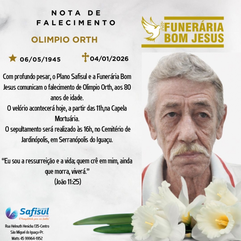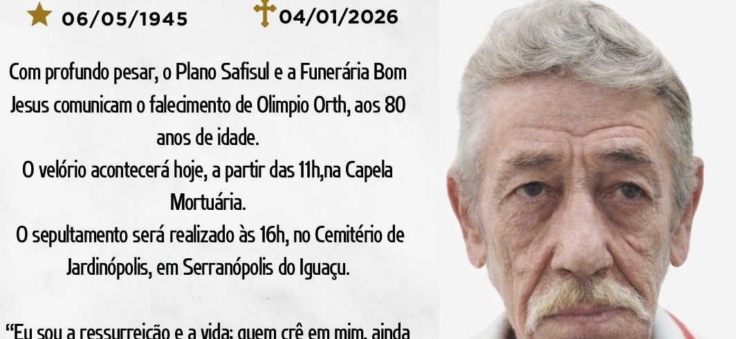 Com profundo pesar, o Plano Safisul e a Funerária Bom Jesus comunicam o falecimento de Olimpio Orth, ocorrido ontem, domingo, 04 de janeiro de 2026.