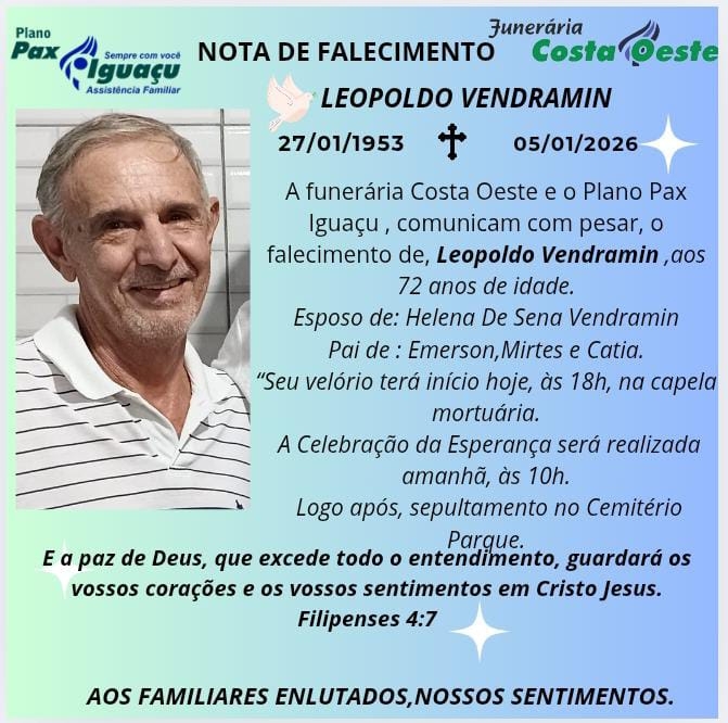 A Funerária Costa Oeste e o Plano Pax Iguaçu comunicam, com profundo pesar, o falecimento de Leopoldo Vendramin, ocorrido nesta segunda-feira, 05 de janeiro de 2026, aos 72 anos de idade.