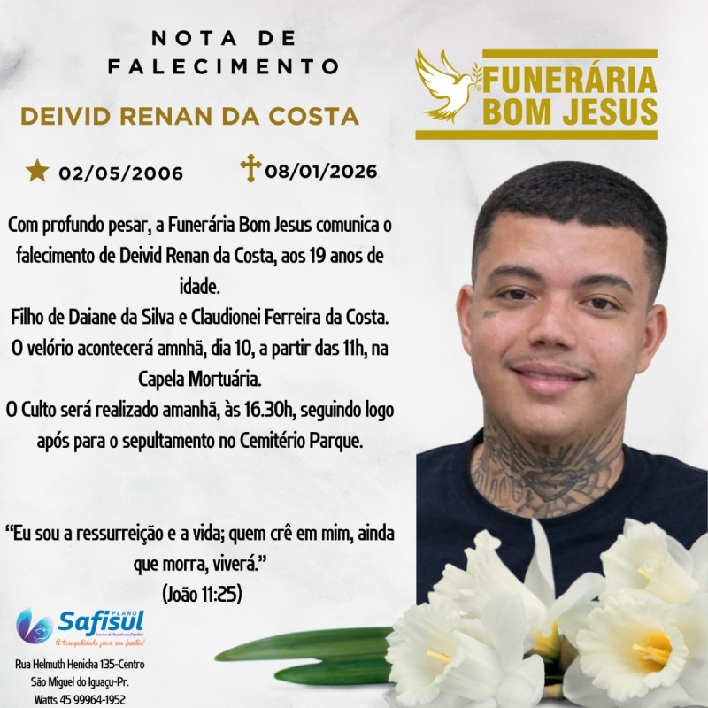 Com profundo pesar, a Funerária Bom Jesus comunica o falecimento de Deivid Renan da Costa, ocorrido na quinta-feira, 08 de janeiro de 2026, aos 19 anos de idade.