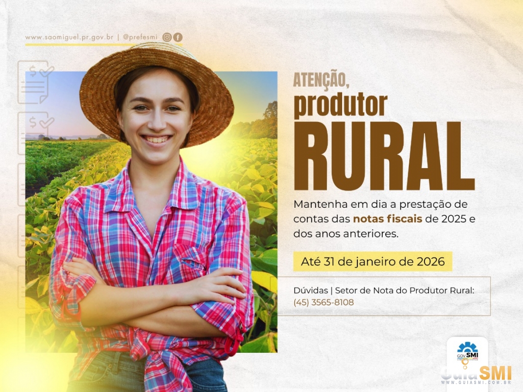 O Governo Municipal de São Miguel do Iguaçu, por intermédio do setor de Nota do Produtor Rural, alerta os produtores rurais para que deixem atualizada a prestação de contas das Notas Fiscais referentes ao ano de 2025 e a exercícios anteriores. O prazo final para a regularização é 31 de janeiro de 2026.