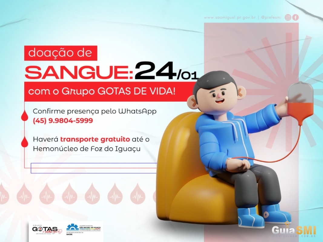 O Grupo Gotas de Vida, vinculado à Secretaria Municipal de Saúde de São Miguel do Iguaçu, convida a comunidade para participar do dia de doação de sangue que será realizado neste sábado, 24 de janeiro, marcando a primeira ação de 2026.