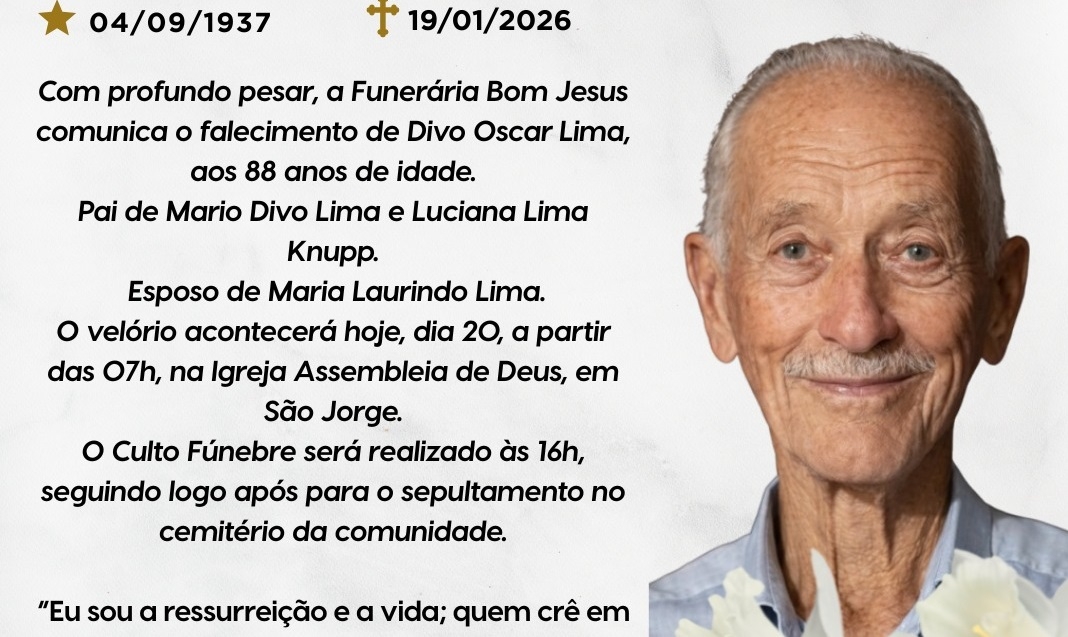 Com profundo pesar, a Funerária Bom Jesus comunica o falecimento de Divo Oscar Lima, ocorrido ontem, 19 de janeiro de 2026, aos 88 anos de idade.