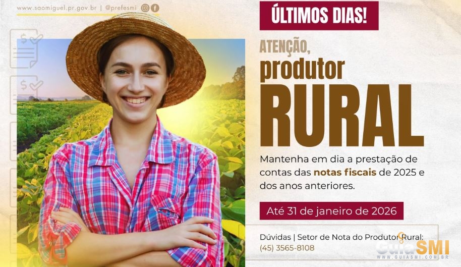 O Governo Municipal de São Miguel do Iguaçu, por intermédio do setor de Nota do Produtor Rural, alerta os produtores rurais para que deixem atualizada a prestação de contas das Notas Fiscais referentes ao ano de 2025 e a exercícios anteriores. O prazo final para a regularização é 31 de janeiro de 2026.