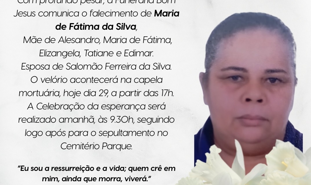Com profundo pesar, a Funerária Bom Jesus comunica o falecimento de Maria de Fátima da Silva, ocorrido nesta quinta-feira, 29 de janeiro de 2026, aos 53 anos de idade.