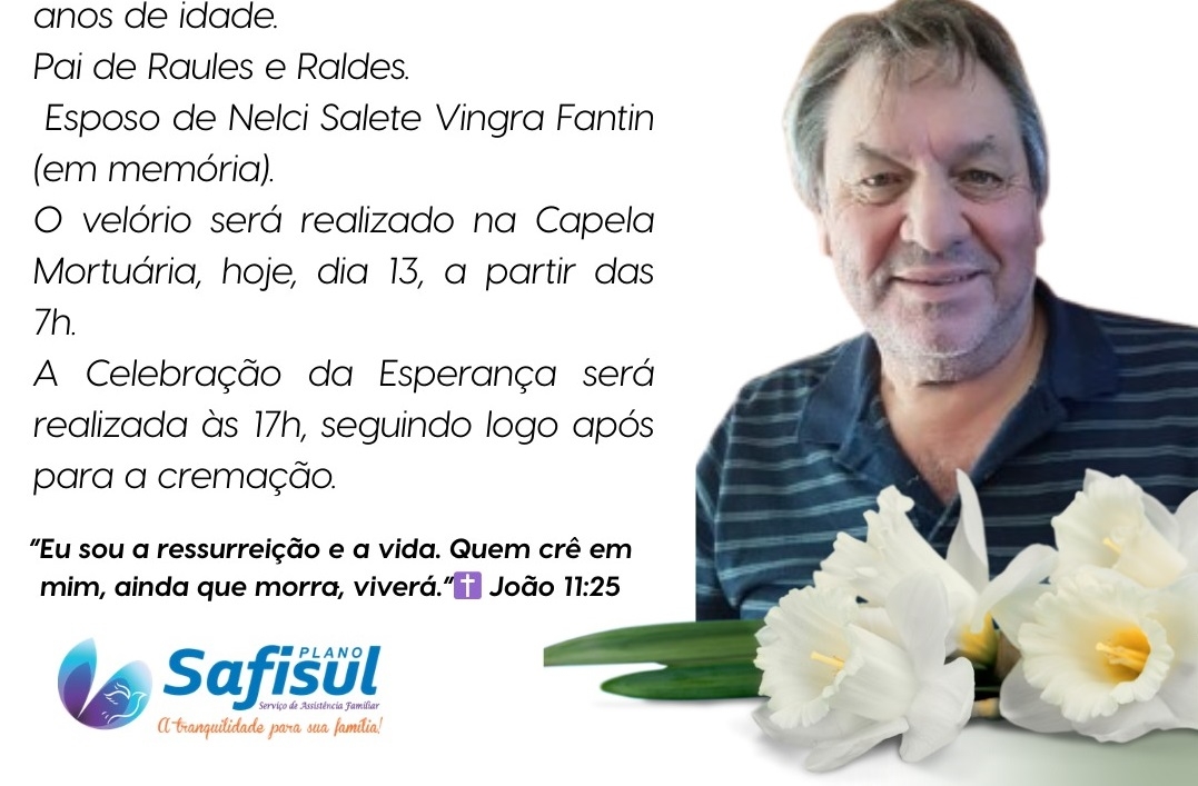 Ele era pai de Raules e Raldes e esposo de Nelci Salete Vingra Fantin (em memória). O velório será realizado na Capela Mortuária, nesta sexta-feira, dia 13, a partir das 7h.