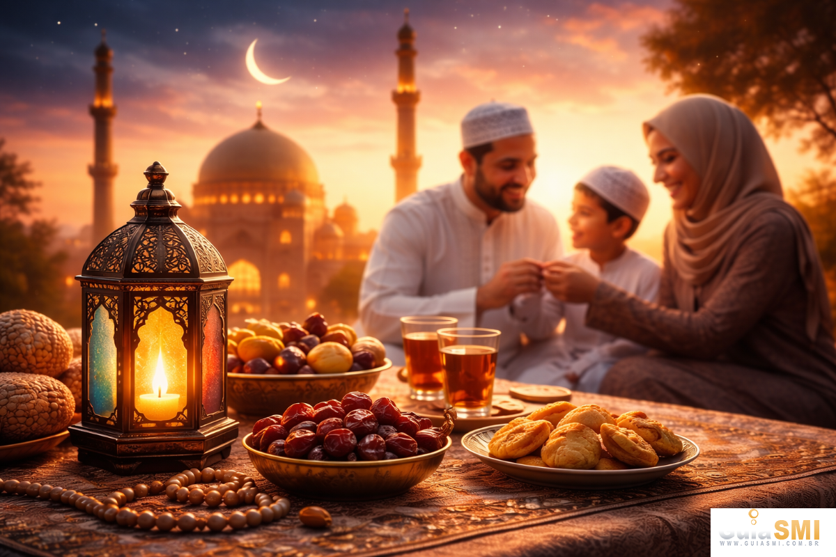 Ao final do mês sagrado, os muçulmanos celebram o Eid al-Fitr, festividade que simboliza a conclusão do período de jejum e é marcada por orações coletivas, confraternização e partilha de alimentos.
