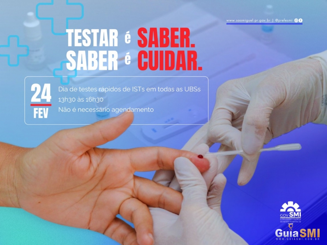 O Governo Municipal de São Miguel do Iguaçu, por meio da Secretaria Municipal de Saúde de São Miguel do Iguaçu, realizará na próxima terça-feira, 24 de fevereiro, um Dia de Testes Rápidos em todas as Unidades Básicas de Saúde (UBSs) do município. A ação ocorrerá das 13h30 às 16h30 e não será necessário agendamento prévio.