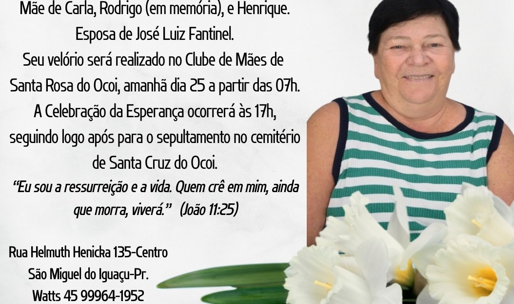 om profundo pesar, o Plano Safisul e a Funerária Bom Jesus comunicaram o falecimento de Clara Nair Horn Fantinel, ocorrido nesta segunda-feira, 24 de fevereiro de 2026, aos 60 anos de idade.