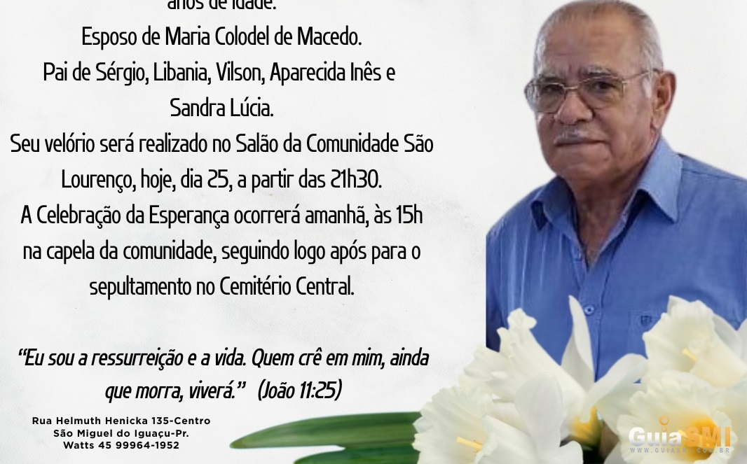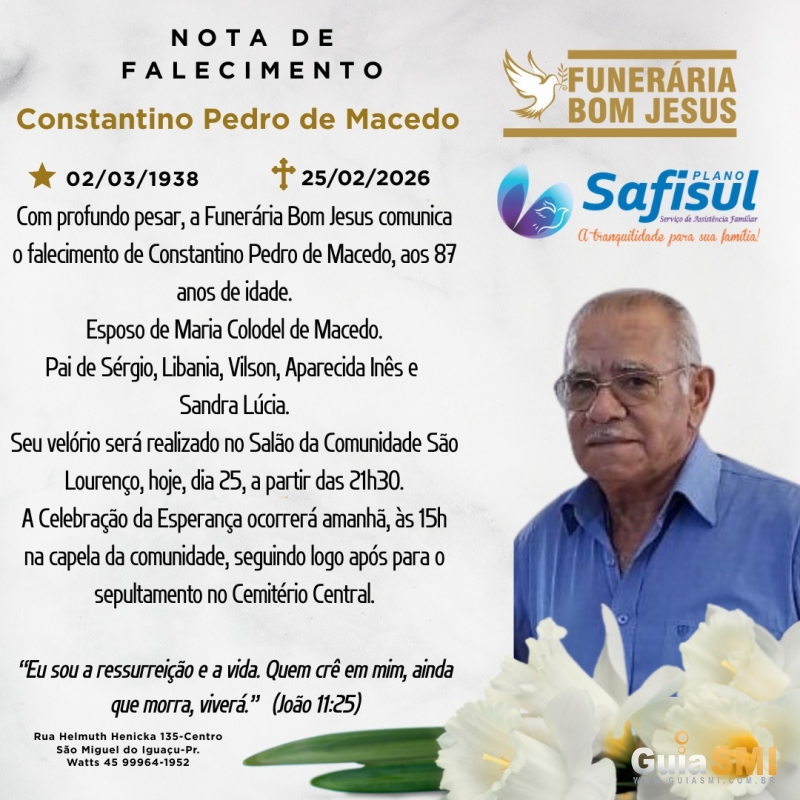 Com profundo pesar, a Funerária Bom Jesus comunica o falecimento de Constantino Pedro de Macedo, ocorrido nesta quarta-feira, 25 de fevereiro de 2026, aos 87 anos de idade.