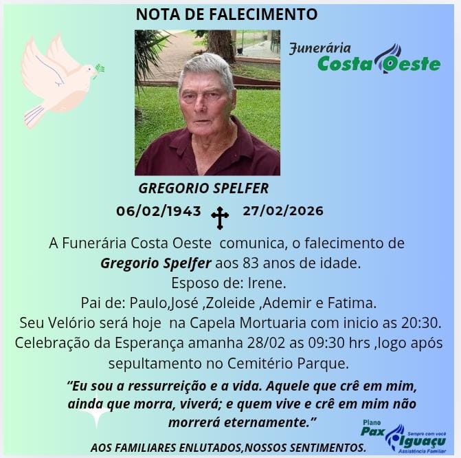 A Funerária Costa Oeste comunica o falecimento de Gregorio Spelfer, ocorrido nesta sexta-feira, 27 de fevereiro de 2026, aos 83 anos de idade.