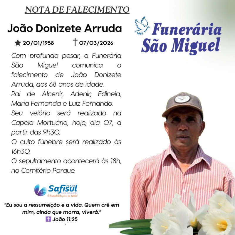 A Funerária São Miguel comunica com profundo pesar o falecimento de João Donizete Arruda, ocorrido neste sábado, 7 de março de 2026, aos 68 anos de idade.