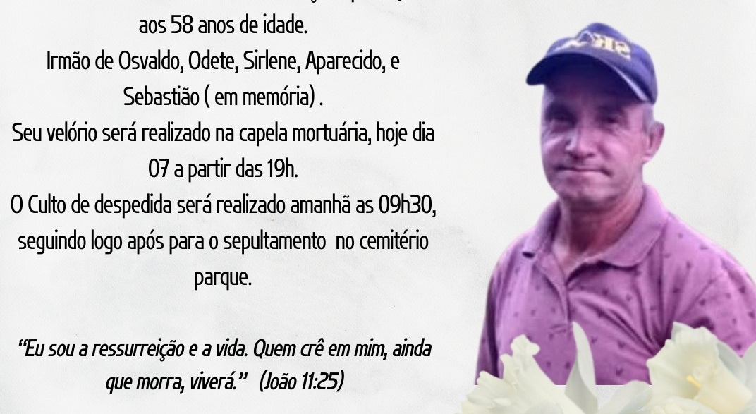 Com profundo pesar, a Funerária Bom Jesus comunica o falecimento de Waldomiro Lourenço Siqueira, ocorrido neste sábado, 7 de março de 2026, aos 58 anos de idade.