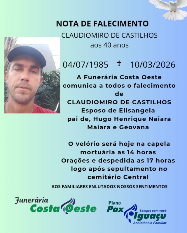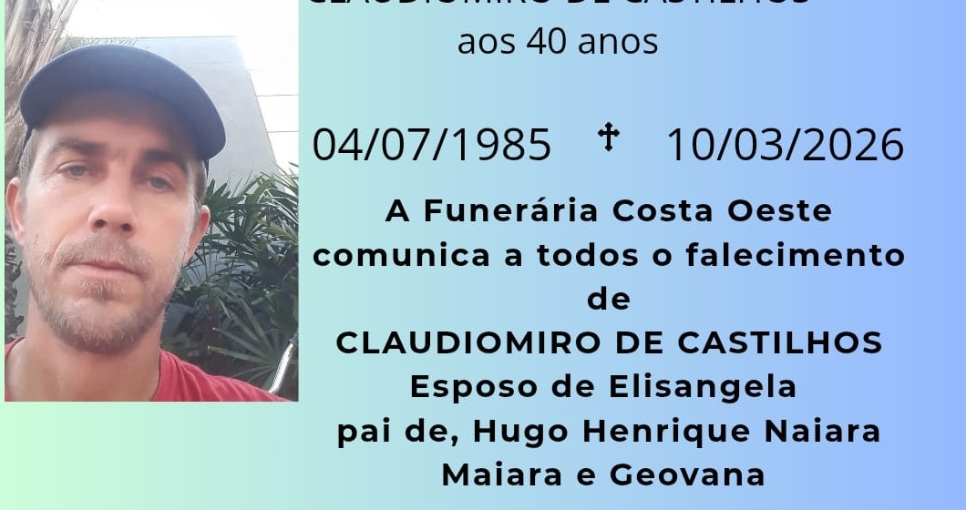 A Funerária Costa Oeste comunica com pesar o falecimento de Claudiomiro de Castilhos, ocorrido na terça-feira (10), aos 40 anos de idade.
