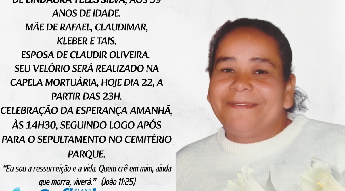 Com profundo pesar, a Funerária Bom Jesus comunica o falecimento de Lindaura Teles da Silva, ocorrido neste sábado, 22 de março de 2026, aos 59 anos de idade.