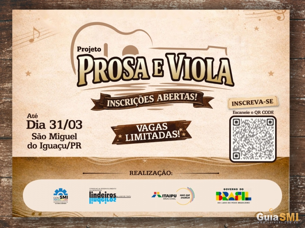 Estão abertas as inscrições para o Projeto Prosa e Viola, iniciativa que levará aulas gratuitas de viola caipira para crianças e adolescentes de São Miguel do Iguaçu. A ação conta com o apoio do Governo Municipal, por meio da Secretaria de Cultura e Esporte, e é promovida pelo Conselho de Desenvolvimento dos Municípios Lindeiros ao Lago de Itaipu, em parceria com a Itaipu Binacional.
