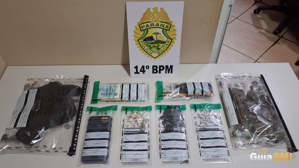 Na pochete abandonada, os agentes encontraram porções de maconha, haxixe, cocaína e crack, todas fracionadas e prontas para comercialização, além de dinheiro em espécie, um smartphone e, nas proximidades, um rádio comunicador. Durante a busca pessoal, foi localizado ainda outro aparelho celular com o abordado.