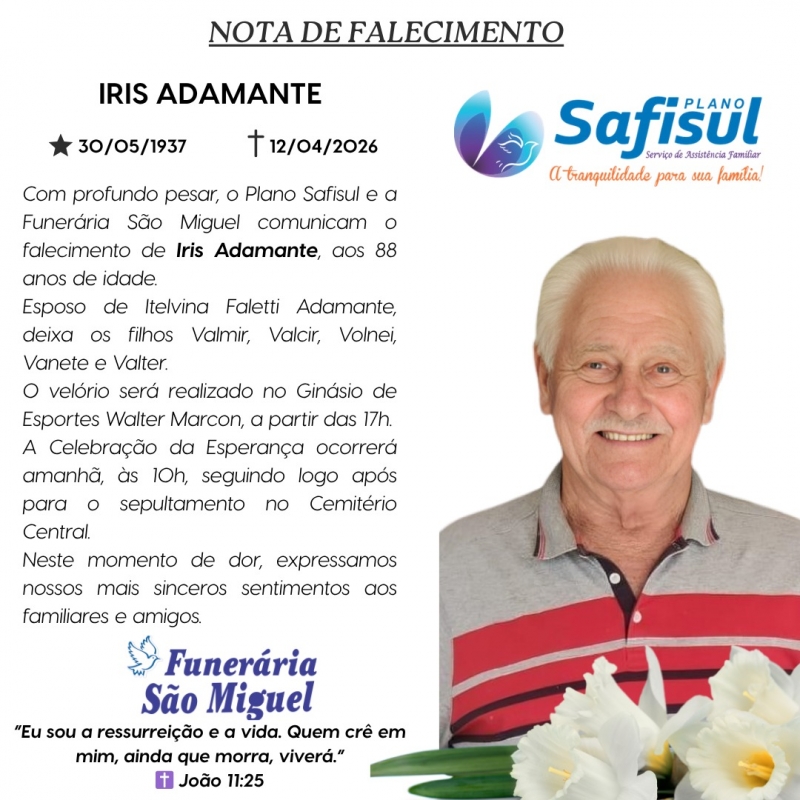 Com profundo pesar, o Plano Safisul e a Funerária São Miguel comunicam o falecimento de Iris Adamante, ocorrido neste domingo, 12 de abril de 2026, aos 88 anos de idade.
