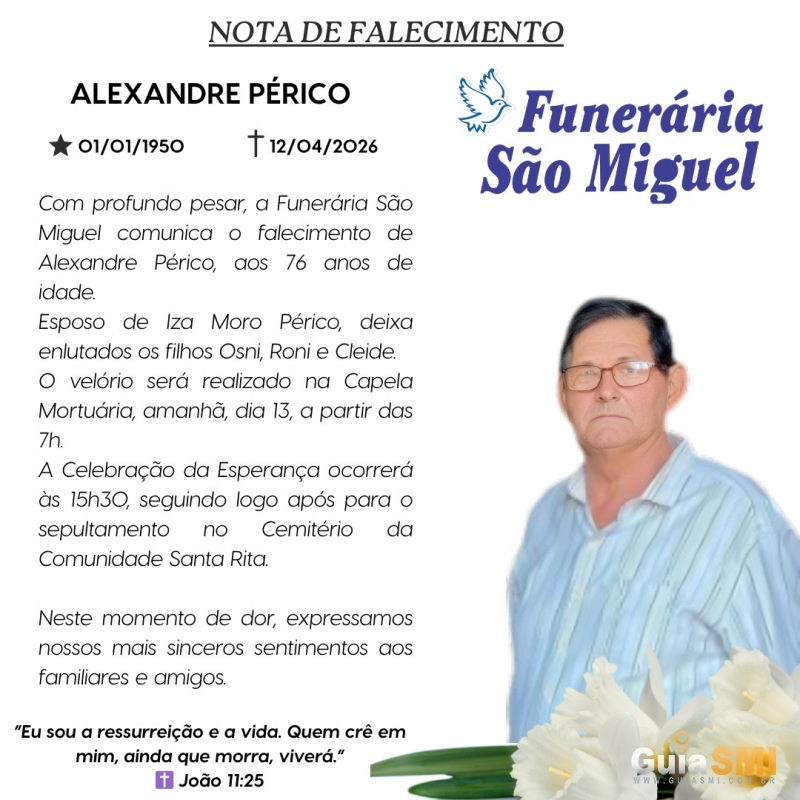 Com profundo pesar, a Funerária São Miguel comunica o falecimento de Alexandre Périco, ocorrido ontem, domingo (12/04/2026), aos 76 anos de idade.