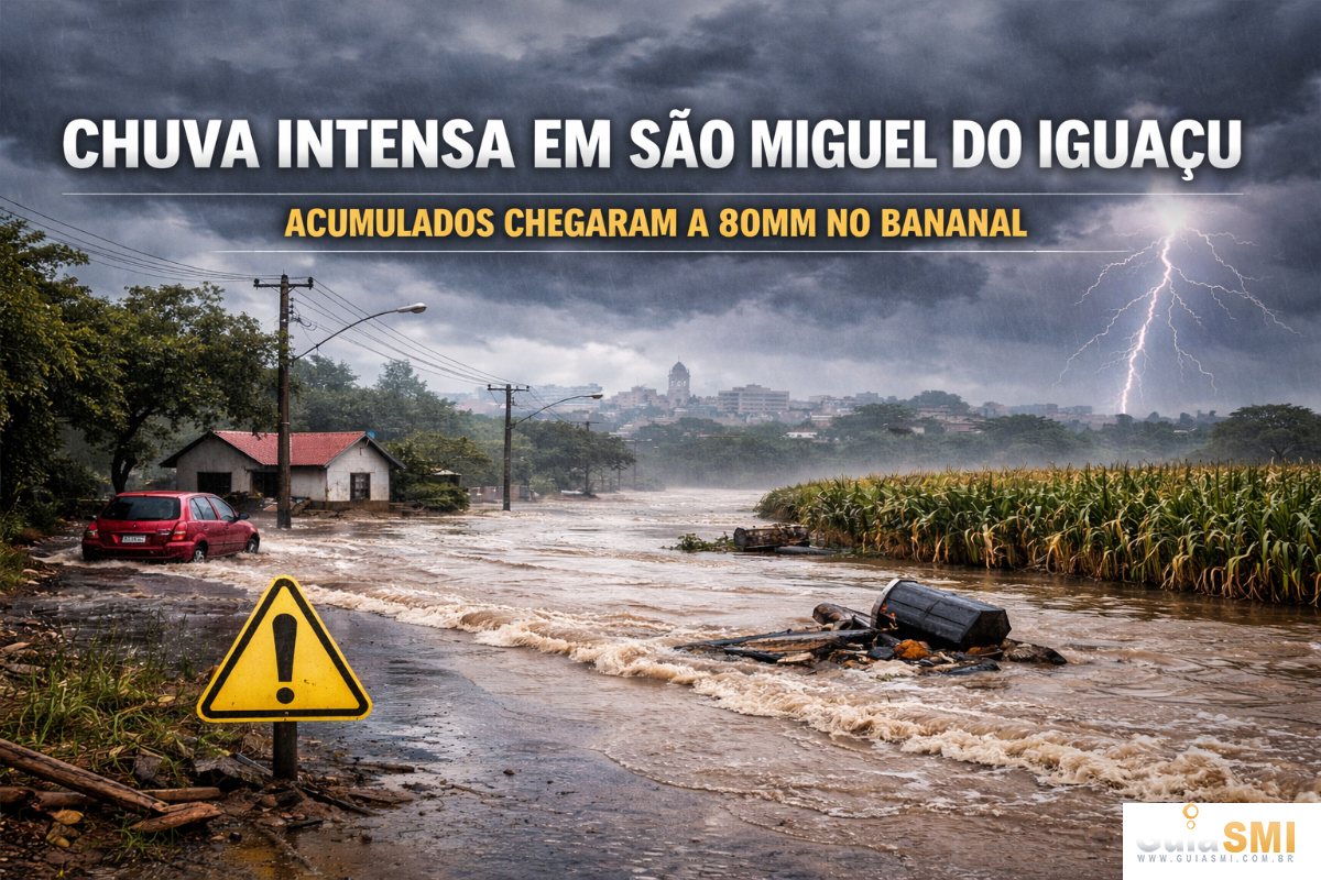 A forte chuva registrada no domingo, dia 12 de abril de 2026, trouxe volumes expressivos de precipitação em diversas localidades de São Miguel do Iguaçu e região. De acordo com os dados levantados, os acumulados variaram entre 50mm e 80mm, com destaque para a comunidade do Bananal, que registrou o maior volume do dia.